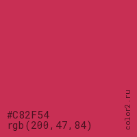 Цвет #C82F54 в цветовой модели RGB обозначается тремя октетами (200, 47, 84) в десятичном формате и #C82F54 в шестнадцатиричном (hex) формате, которые являются интенсивностью красного 200 (hex C8), интенсивность зелёного 47 (hex 2F) и интенсивность синего 84 (hex 54).