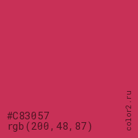 Цвет #C83057 в цветовой модели RGB обозначается тремя октетами (200, 48, 87) в десятичном формате и #C83057 в шестнадцатиричном (hex) формате, которые являются интенсивностью красного 200 (hex C8), интенсивность зелёного 48 (hex 30) и интенсивность синего 87 (hex 57).