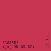 Цвет #C83552 в цветовой модели RGB обозначается тремя октетами (200, 53, 82) в десятичном формате и #C83552 в шестнадцатиричном (hex) формате, которые являются интенсивностью красного 200 (hex C8), интенсивность зелёного 53 (hex 35) и интенсивность синего 82 (hex 52).