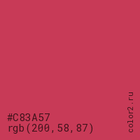 Цвет #C83A57 в цветовой модели RGB обозначается тремя октетами (200, 58, 87) в десятичном формате и #C83A57 в шестнадцатиричном (hex) формате, которые являются интенсивностью красного 200 (hex C8), интенсивность зелёного 58 (hex 3A) и интенсивность синего 87 (hex 57).