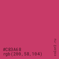 Цвет #C83A68 в цветовой модели RGB обозначается тремя октетами (200, 58, 104) в десятичном формате и #C83A68 в шестнадцатиричном (hex) формате, которые являются интенсивностью красного 200 (hex C8), интенсивность зелёного 58 (hex 3A) и интенсивность синего 104 (hex 68).
