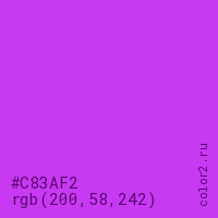 Цвет #C83AF2 в цветовой модели RGB обозначается тремя октетами (200, 58, 242) в десятичном формате и #C83AF2 в шестнадцатиричном (hex) формате, которые являются интенсивностью красного 200 (hex C8), интенсивность зелёного 58 (hex 3A) и интенсивность синего 242 (hex F2).