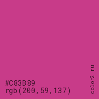 Цвет #C83B89 в цветовой модели RGB обозначается тремя октетами (200, 59, 137) в десятичном формате и #C83B89 в шестнадцатиричном (hex) формате, которые являются интенсивностью красного 200 (hex C8), интенсивность зелёного 59 (hex 3B) и интенсивность синего 137 (hex 89).