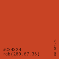 Цвет #C84324 в цветовой модели RGB обозначается тремя октетами (200, 67, 36) в десятичном формате и #C84324 в шестнадцатиричном (hex) формате, которые являются интенсивностью красного 200 (hex C8), интенсивность зелёного 67 (hex 43) и интенсивность синего 36 (hex 24).