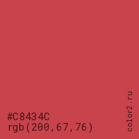 Цвет #C8434C в цветовой модели RGB обозначается тремя октетами (200, 67, 76) в десятичном формате и #C8434C в шестнадцатиричном (hex) формате, которые являются интенсивностью красного 200 (hex C8), интенсивность зелёного 67 (hex 43) и интенсивность синего 76 (hex 4C).