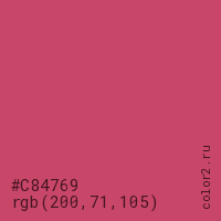 Цвет #C84769 в цветовой модели RGB обозначается тремя октетами (200, 71, 105) в десятичном формате и #C84769 в шестнадцатиричном (hex) формате, которые являются интенсивностью красного 200 (hex C8), интенсивность зелёного 71 (hex 47) и интенсивность синего 105 (hex 69).