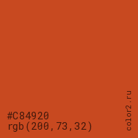 Цвет #C84920 в цветовой модели RGB обозначается тремя октетами (200, 73, 32) в десятичном формате и #C84920 в шестнадцатиричном (hex) формате, которые являются интенсивностью красного 200 (hex C8), интенсивность зелёного 73 (hex 49) и интенсивность синего 32 (hex 20).