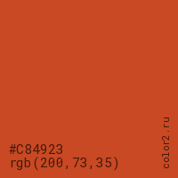 Цвет #C84923 в цветовой модели RGB обозначается тремя октетами (200, 73, 35) в десятичном формате и #C84923 в шестнадцатиричном (hex) формате, которые являются интенсивностью красного 200 (hex C8), интенсивность зелёного 73 (hex 49) и интенсивность синего 35 (hex 23).