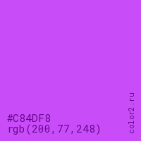 Цвет #C84DF8 в цветовой модели RGB обозначается тремя октетами (200, 77, 248) в десятичном формате и #C84DF8 в шестнадцатиричном (hex) формате, которые являются интенсивностью красного 200 (hex C8), интенсивность зелёного 77 (hex 4D) и интенсивность синего 248 (hex F8).