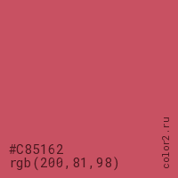 Цвет #C85162 в цветовой модели RGB обозначается тремя октетами (200, 81, 98) в десятичном формате и #C85162 в шестнадцатиричном (hex) формате, которые являются интенсивностью красного 200 (hex C8), интенсивность зелёного 81 (hex 51) и интенсивность синего 98 (hex 62).
