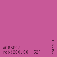 Цвет #C85898 в цветовой модели RGB обозначается тремя октетами (200, 88, 152) в десятичном формате и #C85898 в шестнадцатиричном (hex) формате, которые являются интенсивностью красного 200 (hex C8), интенсивность зелёного 88 (hex 58) и интенсивность синего 152 (hex 98).