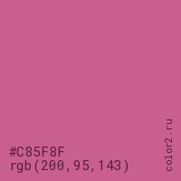 Цвет #C85F8F в цветовой модели RGB обозначается тремя октетами (200, 95, 143) в десятичном формате и #C85F8F в шестнадцатиричном (hex) формате, которые являются интенсивностью красного 200 (hex C8), интенсивность зелёного 95 (hex 5F) и интенсивность синего 143 (hex 8F).