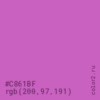 Цвет #C861BF в цветовой модели RGB обозначается тремя октетами (200, 97, 191) в десятичном формате и #C861BF в шестнадцатиричном (hex) формате, которые являются интенсивностью красного 200 (hex C8), интенсивность зелёного 97 (hex 61) и интенсивность синего 191 (hex BF).