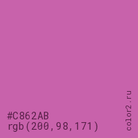Цвет #C862AB в цветовой модели RGB обозначается тремя октетами (200, 98, 171) в десятичном формате и #C862AB в шестнадцатиричном (hex) формате, которые являются интенсивностью красного 200 (hex C8), интенсивность зелёного 98 (hex 62) и интенсивность синего 171 (hex AB).