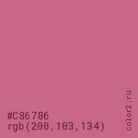 Цвет #C86786 в цветовой модели RGB обозначается тремя октетами (200, 103, 134) в десятичном формате и #C86786 в шестнадцатиричном (hex) формате, которые являются интенсивностью красного 200 (hex C8), интенсивность зелёного 103 (hex 67) и интенсивность синего 134 (hex 86).