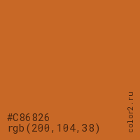 Цвет #C86826 в цветовой модели RGB обозначается тремя октетами (200, 104, 38) в десятичном формате и #C86826 в шестнадцатиричном (hex) формате, которые являются интенсивностью красного 200 (hex C8), интенсивность зелёного 104 (hex 68) и интенсивность синего 38 (hex 26).