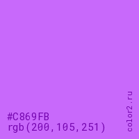 Цвет #C869FB в цветовой модели RGB обозначается тремя октетами (200, 105, 251) в десятичном формате и #C869FB в шестнадцатиричном (hex) формате, которые являются интенсивностью красного 200 (hex C8), интенсивность зелёного 105 (hex 69) и интенсивность синего 251 (hex FB).
