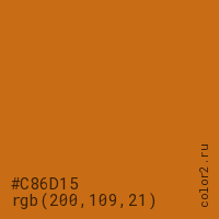 Цвет #C86D15 в цветовой модели RGB обозначается тремя октетами (200, 109, 21) в десятичном формате и #C86D15 в шестнадцатиричном (hex) формате, которые являются интенсивностью красного 200 (hex C8), интенсивность зелёного 109 (hex 6D) и интенсивность синего 21 (hex 15).