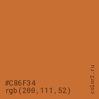 Цвет #C86F34 в цветовой модели RGB обозначается тремя октетами (200, 111, 52) в десятичном формате и #C86F34 в шестнадцатиричном (hex) формате, которые являются интенсивностью красного 200 (hex C8), интенсивность зелёного 111 (hex 6F) и интенсивность синего 52 (hex 34).