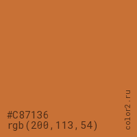 Цвет #C87136 в цветовой модели RGB обозначается тремя октетами (200, 113, 54) в десятичном формате и #C87136 в шестнадцатиричном (hex) формате, которые являются интенсивностью красного 200 (hex C8), интенсивность зелёного 113 (hex 71) и интенсивность синего 54 (hex 36).