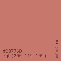 Цвет #C8776D в цветовой модели RGB обозначается тремя октетами (200, 119, 109) в десятичном формате и #C8776D в шестнадцатиричном (hex) формате, которые являются интенсивностью красного 200 (hex C8), интенсивность зелёного 119 (hex 77) и интенсивность синего 109 (hex 6D).