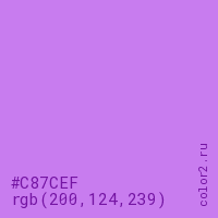 Цвет #C87CEF в цветовой модели RGB обозначается тремя октетами (200, 124, 239) в десятичном формате и #C87CEF в шестнадцатиричном (hex) формате, которые являются интенсивностью красного 200 (hex C8), интенсивность зелёного 124 (hex 7C) и интенсивность синего 239 (hex EF).