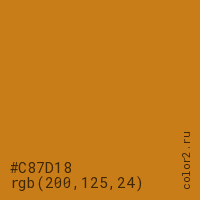 Цвет #C87D18 в цветовой модели RGB обозначается тремя октетами (200, 125, 24) в десятичном формате и #C87D18 в шестнадцатиричном (hex) формате, которые являются интенсивностью красного 200 (hex C8), интенсивность зелёного 125 (hex 7D) и интенсивность синего 24 (hex 18).