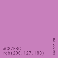 Цвет #C87FBC в цветовой модели RGB обозначается тремя октетами (200, 127, 188) в десятичном формате и #C87FBC в шестнадцатиричном (hex) формате, которые являются интенсивностью красного 200 (hex C8), интенсивность зелёного 127 (hex 7F) и интенсивность синего 188 (hex BC).
