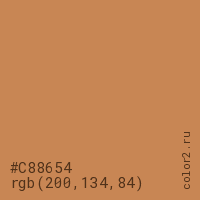Цвет #C88654 в цветовой модели RGB обозначается тремя октетами (200, 134, 84) в десятичном формате и #C88654 в шестнадцатиричном (hex) формате, которые являются интенсивностью красного 200 (hex C8), интенсивность зелёного 134 (hex 86) и интенсивность синего 84 (hex 54).