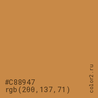 Цвет #C88947 в цветовой модели RGB обозначается тремя октетами (200, 137, 71) в десятичном формате и #C88947 в шестнадцатиричном (hex) формате, которые являются интенсивностью красного 200 (hex C8), интенсивность зелёного 137 (hex 89) и интенсивность синего 71 (hex 47).