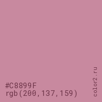 Цвет #C8899F в цветовой модели RGB обозначается тремя октетами (200, 137, 159) в десятичном формате и #C8899F в шестнадцатиричном (hex) формате, которые являются интенсивностью красного 200 (hex C8), интенсивность зелёного 137 (hex 89) и интенсивность синего 159 (hex 9F).