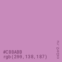 Цвет #C88ABB в цветовой модели RGB обозначается тремя октетами (200, 138, 187) в десятичном формате и #C88ABB в шестнадцатиричном (hex) формате, которые являются интенсивностью красного 200 (hex C8), интенсивность зелёного 138 (hex 8A) и интенсивность синего 187 (hex BB).