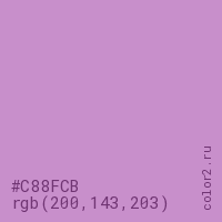 Цвет #C88FCB в цветовой модели RGB обозначается тремя октетами (200, 143, 203) в десятичном формате и #C88FCB в шестнадцатиричном (hex) формате, которые являются интенсивностью красного 200 (hex C8), интенсивность зелёного 143 (hex 8F) и интенсивность синего 203 (hex CB).