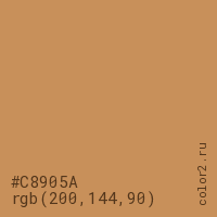 Цвет #C8905A в цветовой модели RGB обозначается тремя октетами (200, 144, 90) в десятичном формате и #C8905A в шестнадцатиричном (hex) формате, которые являются интенсивностью красного 200 (hex C8), интенсивность зелёного 144 (hex 90) и интенсивность синего 90 (hex 5A).