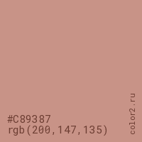 Цвет #C89387 в цветовой модели RGB обозначается тремя октетами (200, 147, 135) в десятичном формате и #C89387 в шестнадцатиричном (hex) формате, которые являются интенсивностью красного 200 (hex C8), интенсивность зелёного 147 (hex 93) и интенсивность синего 135 (hex 87).
