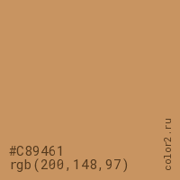 Цвет #C89461 в цветовой модели RGB обозначается тремя октетами (200, 148, 97) в десятичном формате и #C89461 в шестнадцатиричном (hex) формате, которые являются интенсивностью красного 200 (hex C8), интенсивность зелёного 148 (hex 94) и интенсивность синего 97 (hex 61).