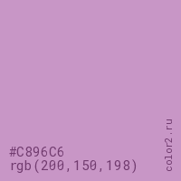 Цвет #C896C6 в цветовой модели RGB обозначается тремя октетами (200, 150, 198) в десятичном формате и #C896C6 в шестнадцатиричном (hex) формате, которые являются интенсивностью красного 200 (hex C8), интенсивность зелёного 150 (hex 96) и интенсивность синего 198 (hex C6).