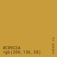 Цвет #C89C3A в цветовой модели RGB обозначается тремя октетами (200, 156, 58) в десятичном формате и #C89C3A в шестнадцатиричном (hex) формате, которые являются интенсивностью красного 200 (hex C8), интенсивность зелёного 156 (hex 9C) и интенсивность синего 58 (hex 3A).