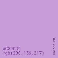 Цвет #C89CD9 в цветовой модели RGB обозначается тремя октетами (200, 156, 217) в десятичном формате и #C89CD9 в шестнадцатиричном (hex) формате, которые являются интенсивностью красного 200 (hex C8), интенсивность зелёного 156 (hex 9C) и интенсивность синего 217 (hex D9).
