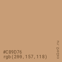 Цвет #C89D76 в цветовой модели RGB обозначается тремя октетами (200, 157, 118) в десятичном формате и #C89D76 в шестнадцатиричном (hex) формате, которые являются интенсивностью красного 200 (hex C8), интенсивность зелёного 157 (hex 9D) и интенсивность синего 118 (hex 76).