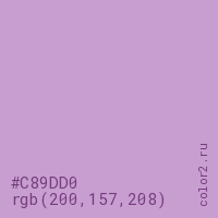 Цвет #C89DD0 в цветовой модели RGB обозначается тремя октетами (200, 157, 208) в десятичном формате и #C89DD0 в шестнадцатиричном (hex) формате, которые являются интенсивностью красного 200 (hex C8), интенсивность зелёного 157 (hex 9D) и интенсивность синего 208 (hex D0).