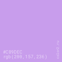 Цвет #C89DEC в цветовой модели RGB обозначается тремя октетами (200, 157, 236) в десятичном формате и #C89DEC в шестнадцатиричном (hex) формате, которые являются интенсивностью красного 200 (hex C8), интенсивность зелёного 157 (hex 9D) и интенсивность синего 236 (hex EC).