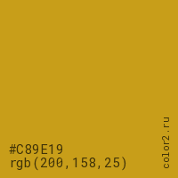 Цвет #C89E19 в цветовой модели RGB обозначается тремя октетами (200, 158, 25) в десятичном формате и #C89E19 в шестнадцатиричном (hex) формате, которые являются интенсивностью красного 200 (hex C8), интенсивность зелёного 158 (hex 9E) и интенсивность синего 25 (hex 19).