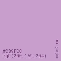 Цвет #C89FCC в цветовой модели RGB обозначается тремя октетами (200, 159, 204) в десятичном формате и #C89FCC в шестнадцатиричном (hex) формате, которые являются интенсивностью красного 200 (hex C8), интенсивность зелёного 159 (hex 9F) и интенсивность синего 204 (hex CC).