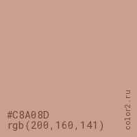 Цвет #C8A08D в цветовой модели RGB обозначается тремя октетами (200, 160, 141) в десятичном формате и #C8A08D в шестнадцатиричном (hex) формате, которые являются интенсивностью красного 200 (hex C8), интенсивность зелёного 160 (hex A0) и интенсивность синего 141 (hex 8D).