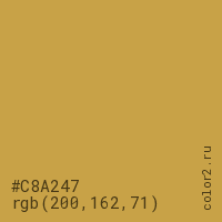 Цвет #C8A247 в цветовой модели RGB обозначается тремя октетами (200, 162, 71) в десятичном формате и #C8A247 в шестнадцатиричном (hex) формате, которые являются интенсивностью красного 200 (hex C8), интенсивность зелёного 162 (hex A2) и интенсивность синего 71 (hex 47).