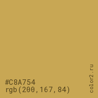 Цвет #C8A754 в цветовой модели RGB обозначается тремя октетами (200, 167, 84) в десятичном формате и #C8A754 в шестнадцатиричном (hex) формате, которые являются интенсивностью красного 200 (hex C8), интенсивность зелёного 167 (hex A7) и интенсивность синего 84 (hex 54).