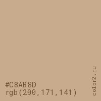Цвет #C8AB8D в цветовой модели RGB обозначается тремя октетами (200, 171, 141) в десятичном формате и #C8AB8D в шестнадцатиричном (hex) формате, которые являются интенсивностью красного 200 (hex C8), интенсивность зелёного 171 (hex AB) и интенсивность синего 141 (hex 8D).