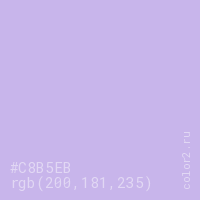 Цвет #C8B5EB в цветовой модели RGB обозначается тремя октетами (200, 181, 235) в десятичном формате и #C8B5EB в шестнадцатиричном (hex) формате, которые являются интенсивностью красного 200 (hex C8), интенсивность зелёного 181 (hex B5) и интенсивность синего 235 (hex EB).