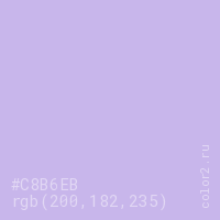 Цвет #C8B6EB в цветовой модели RGB обозначается тремя октетами (200, 182, 235) в десятичном формате и #C8B6EB в шестнадцатиричном (hex) формате, которые являются интенсивностью красного 200 (hex C8), интенсивность зелёного 182 (hex B6) и интенсивность синего 235 (hex EB).